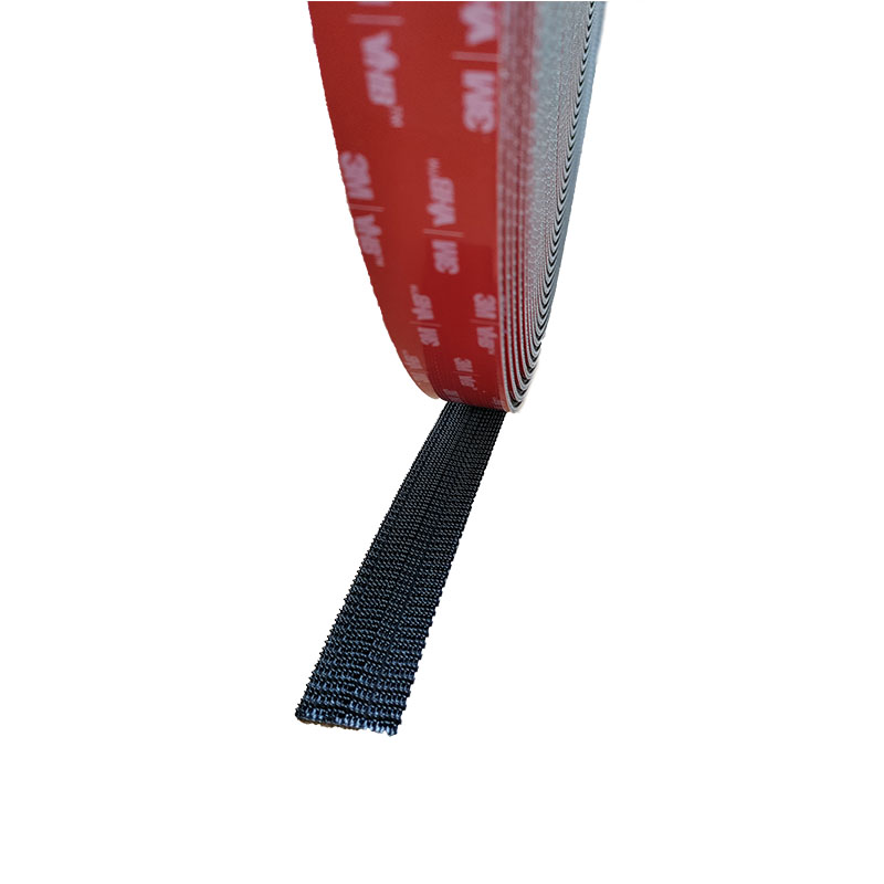 - Black fastener with mushroom shaped stems, backed with an acrylic pressure sensitive adhesive